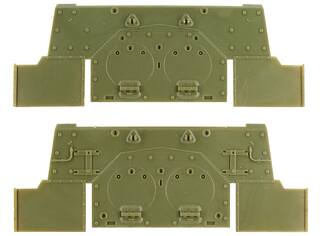 Для кормового листа дано два варианта установки кронштейна орудия по походному (сами опорные пластины кронштейна правильные, военного времени) два варианта исполнения карты петли откидной части кормовой детали, а так же лист с имитацией крепления БДШ, и без этого крепления. Показан проволочный водоотвод, вокруг откидной части кормового листа – достаточно масштабно.